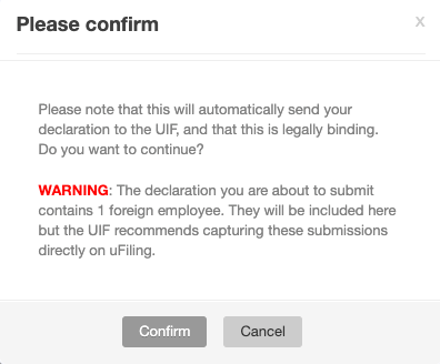 The UIF has recommended that declarations for foreign employees be captured on uFiling to avoid delays with paying UIF benefits to foreign employees. When clicking on Submit for a finalised UIF Declaration, you will be notified of foreign employees in the UIF Declaration. These foreign employees will still be submitted as part of the UIF Declaration. However, as a precautionary measure, we recommend also submitting their declarations on uFiling.