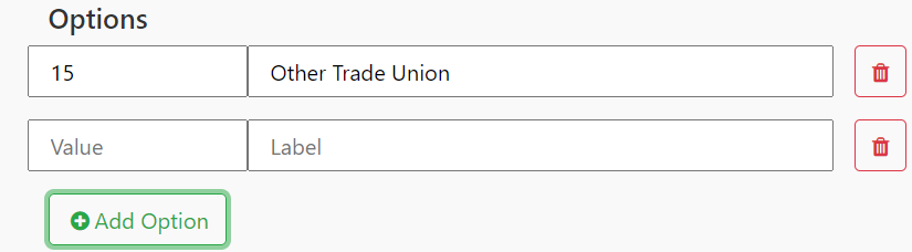 Ensure that you have entered the code in the Value field and the trade union name / text in the Label field.